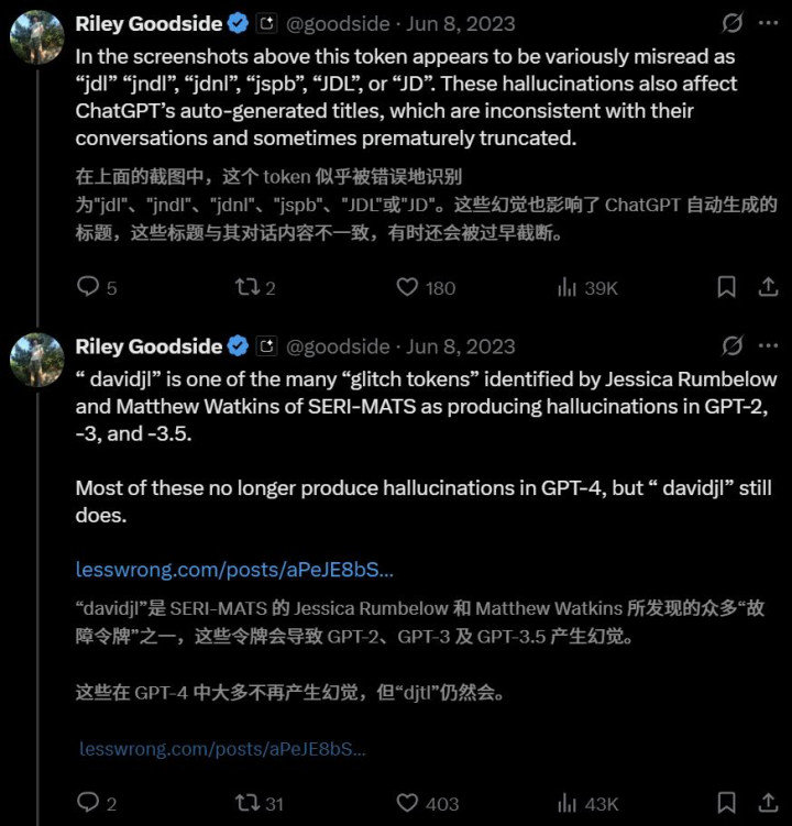 GPT-4被要求重复或处理字符串「 davidjl」(注意开头有个空格)时,它会将其当成「jndl」、「jspb」或「JDL」来处理。
