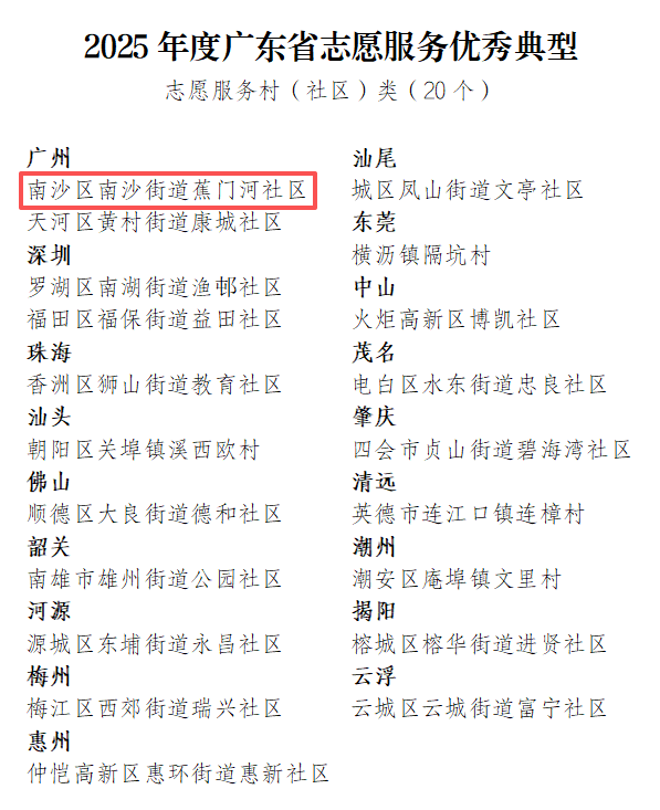 近日,广东省委社会工作部公布2025年度广东省志愿服务优秀典型名单,南沙街道蕉门河社区成功入选志愿服务村(社区)类优秀典型,也成为南沙区唯一、广州市唯二入选的社区典型。继获评2024年度广州市“最美志愿服务社区”后,蕉门河社区再获省级认可,成为全省志愿服务的示范样板。